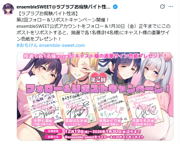 ※キャンペーンにご参加いただくにはXアカウントが必要となります。 ※18歳未満の方はキャンペーンにご参加いただけません。 ※当選者の発表はダイレクトメッセージの送付をもって代えさせていただきます。 ※当選者の方は、1週間以内にご返信いただけない場合、当選無効とし再抽選を行わせていただきます。 ※プレゼントの発送は国内に限らせていただきます。