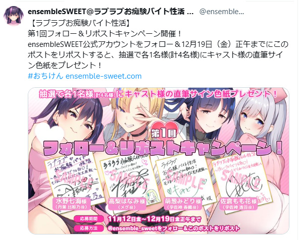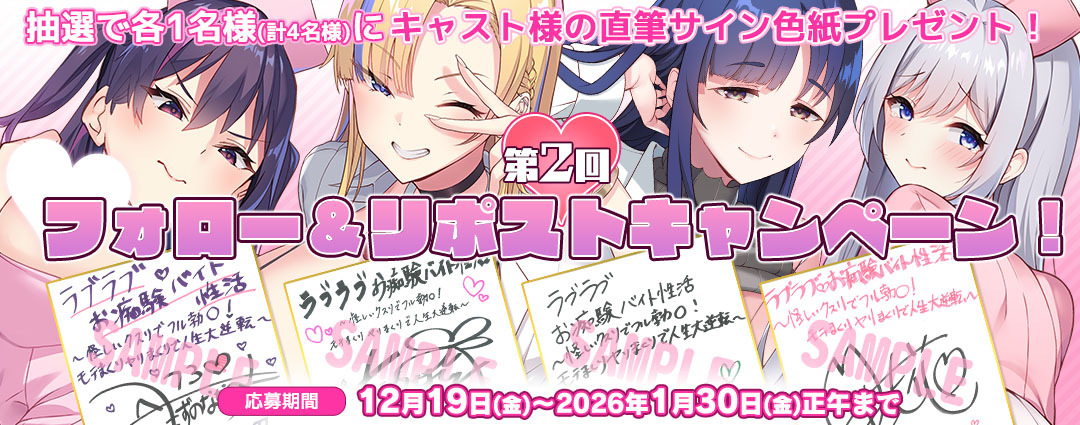 ※キャンペーンにご参加いただくにはXアカウントが必要となります。 ※18歳未満の方はキャンペーンにご参加いただけません。 ※当選者の発表はダイレクトメッセージの送付をもって代えさせていただきます。 ※当選者の方は、1週間以内にご返信いただけない場合、当選無効とし再抽選を行わせていただきます。 ※プレゼントの発送は国内に限らせていただきます。